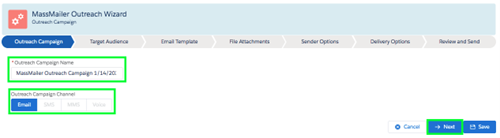 - To begin with Outreach Wizard, you need to go to the MassMailer app and click on the ‘MassMailer Outreach Wizard’ tab. It then displays several navigational steps such as Target Audience, Outreach Campaign, etc.