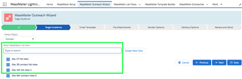 - In the subsequent step, you need to select the target audience or object you want to send emails to, along with the respective list view you wish to choose from the drop-down list.